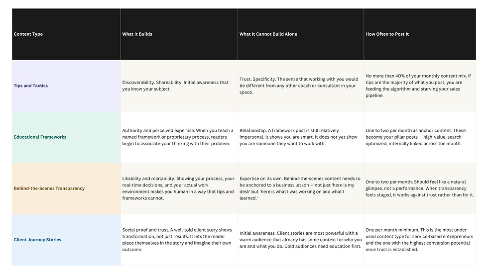 Read that table carefully. Notice that no single content type builds everything on its own. Tips create discoverability. Frameworks build credibility. Transparency builds relationship. Client stories build conviction. You need all four in rotation — not as a rigid formula, but as an intentional mix that gives your audience every signal they need to say yes.